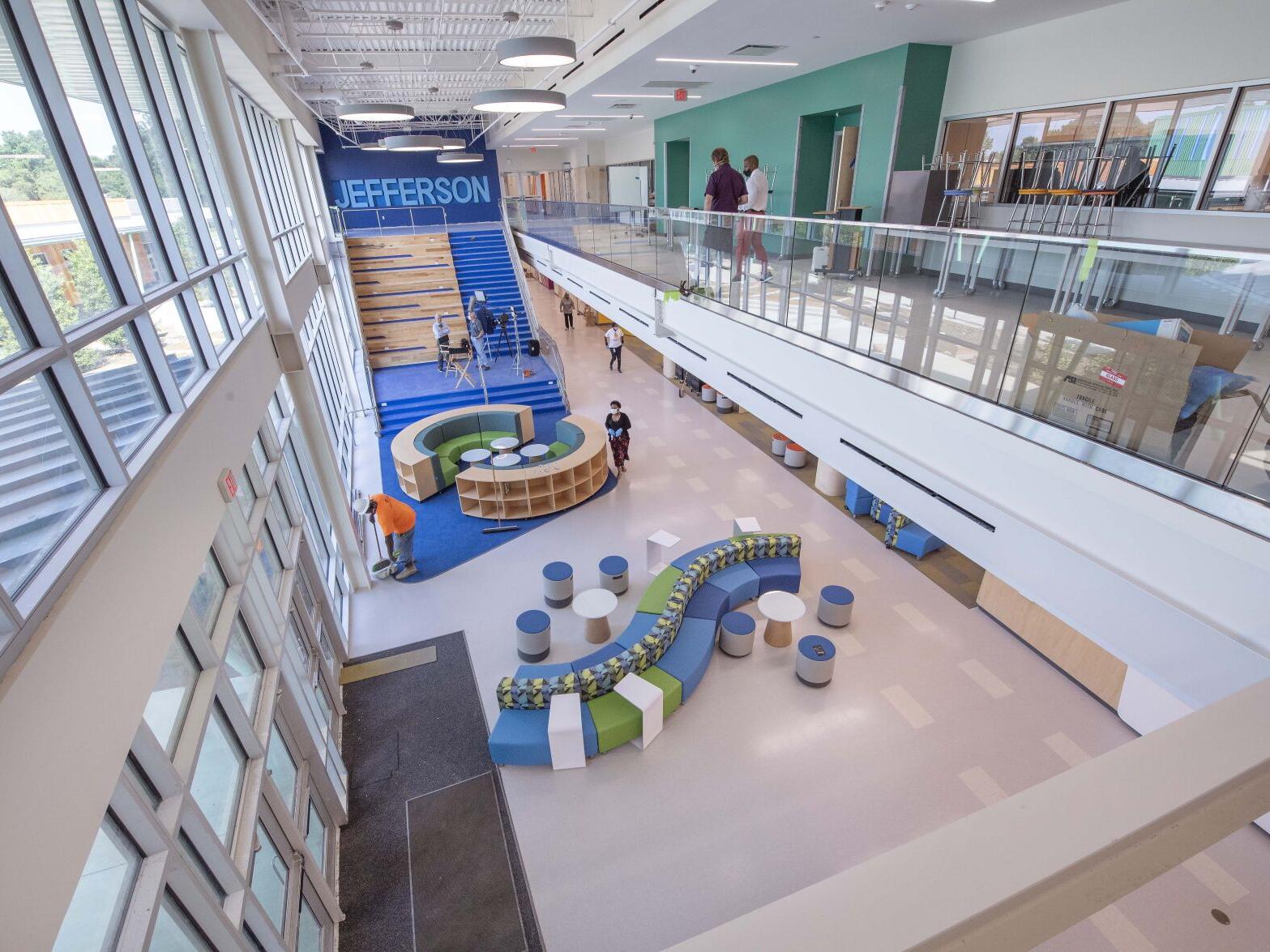 The common area at Jefferson Terrace Academy the new K-8 school replacing nearby Jefferson Terrace Elementary Tuesday August 4 2020 in Baton Rouge La. Jefferson Terrace Academy is located at 5601 Upton Dr in Baton Rouge Louisiana 70809. 9512 Brookline Avenue Baton Rouge Louisiana 70809.